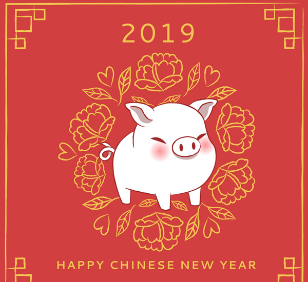 猪和牡丹花贺卡